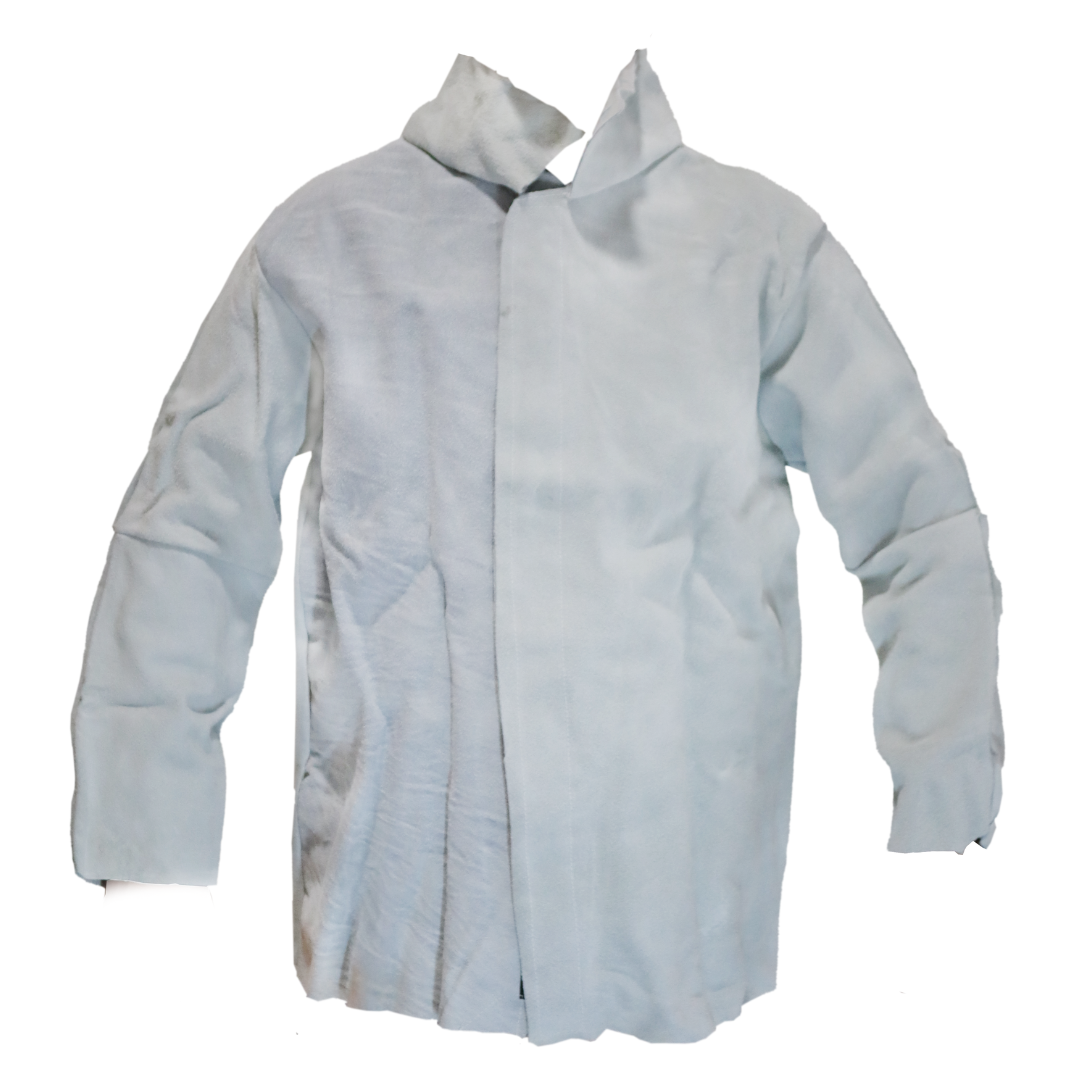 Confeccionado em raspa, com mangas e gola, e velcro para fechamento frontal.