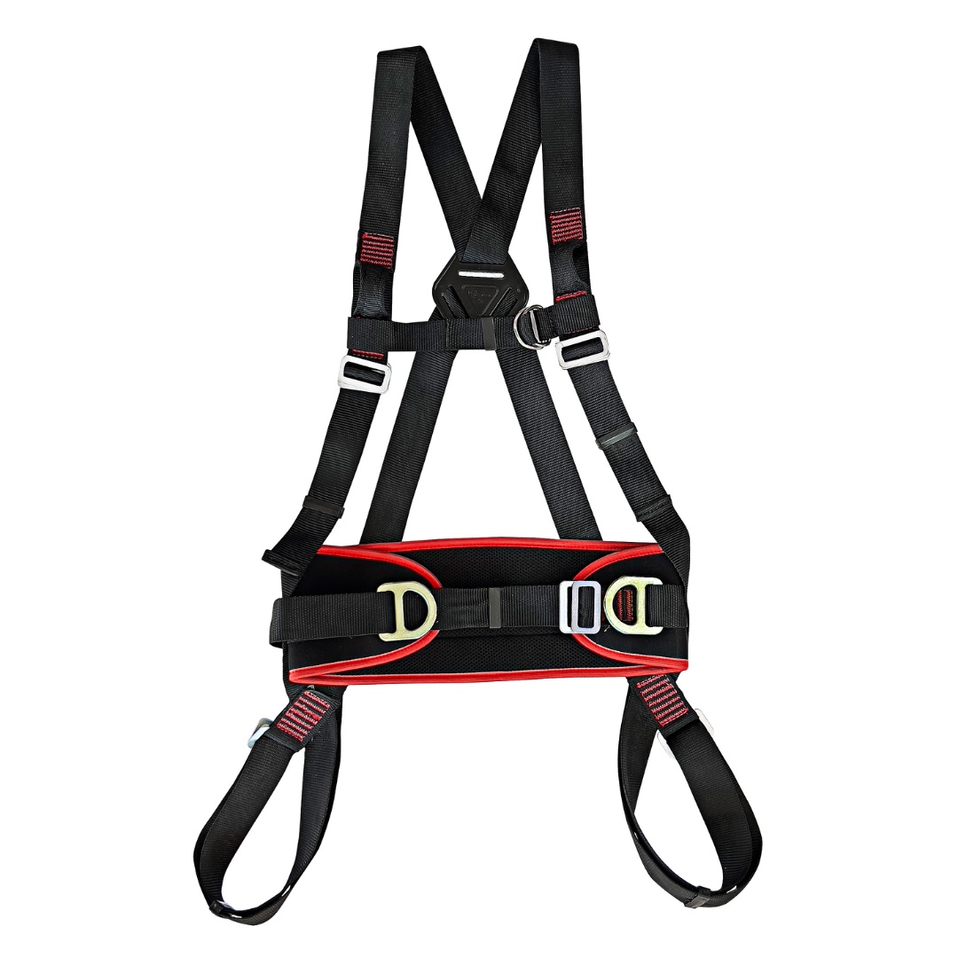 Confeccionado em fita de poliéster de 45 mm e fita secundária de poliéster de 35mm. Possui 3 pontos de conexão, sendo dois laços frontais em fita para retenção de queda, três meias‑argolas em “D” confeccionadas em aço forjado, duas nas laterais do cinto para posicionamento e uma dorsal para retenção de queda. Possui 5 fivelas duplas sem pino confeccionadas em aço estampado para ajuste: Uma na cintura, duas nas pernas e duas no suspensório. Possui duas fivelas simples confeccionadas em aço forjado para ajuste peitoral.