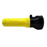 Corpo confeccionado em alumínio fundido, com fechamento roscado e trava através de um parafuso, alimentada por duas pilhas D grandes, lente de vidro temperado de 8mm, acionamento “liga e desliga”, vedação interna das pilhas através de um invólucro de borracha e orifício de passagem de cordão para manuseio.