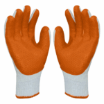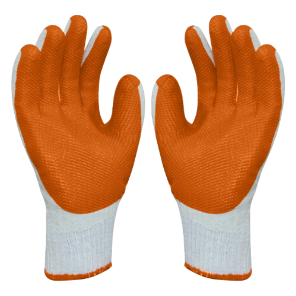 Luva de segurança confeccionada com suporte têxtil, acabamento de borracha na palma da mão, na cor laranja, leve camada de látex natural no dorso e punho elástico.