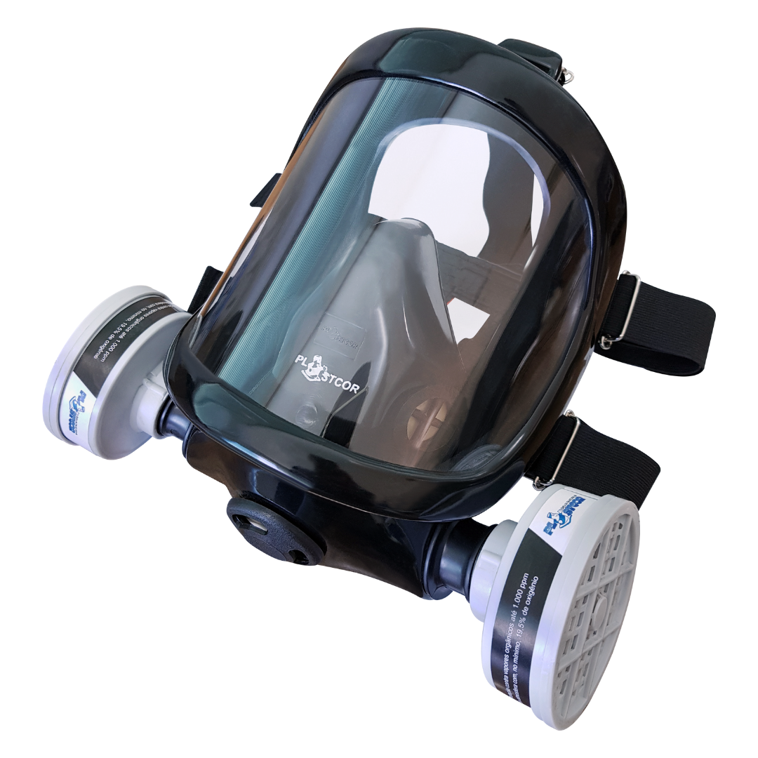 Máscara panorâmica respiratória indicada para proteção completa da face e das vias respiratórias, ideal para uso profissional em ambientes com contaminantes químicos e gases.